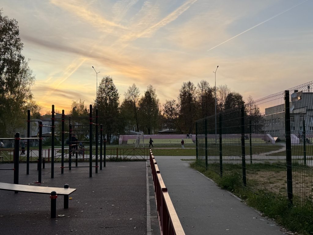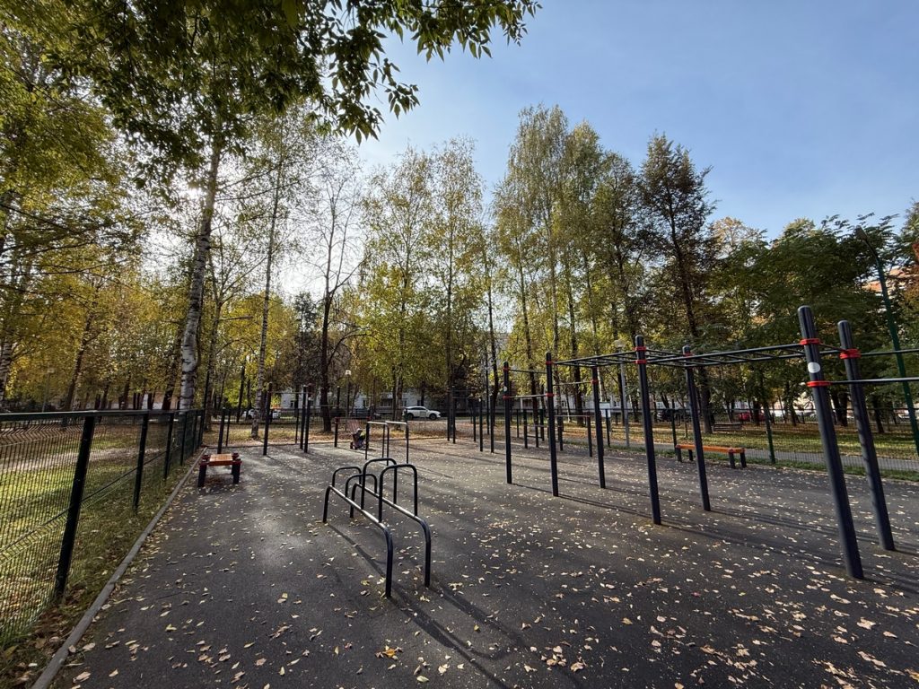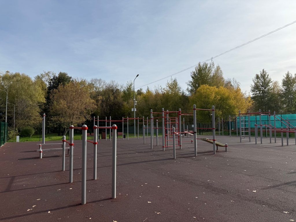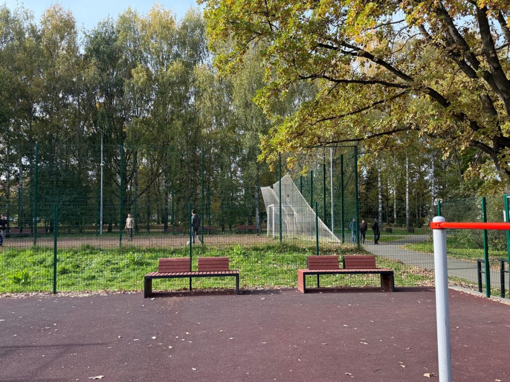 Спортивная площадка оборудована тренажёрами. Покрытие из резиновой крошки подходит для прыжков и активных тренировок. Для любителей футбола и волейбола рядом есть две огороженные площадки для занятия этими видами спорта. Вход свободный и всегда открытый.