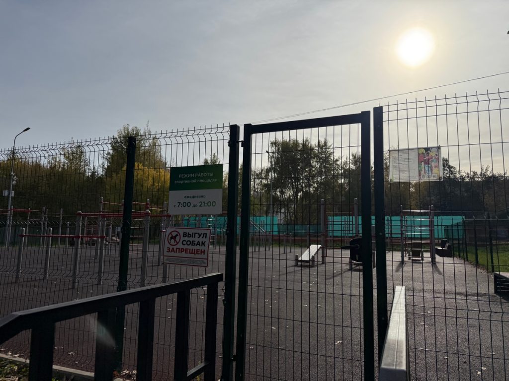 Закрытая территория оборудована турниками, рукоходами, брусьями, каскадом для упражнений на пресс. Есть лавочка, а также столбики и лавка с упорами для воркаута.