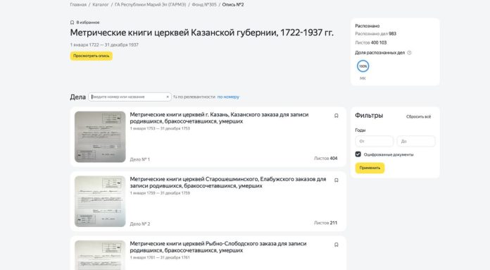 В коллекцию сервиса «Поиск по архивам» вошло более полумиллиона новых сканов, включая полностью оцифрованный фонд 305 опись 2 Государственного архива Республики Марий Эл. В нём содержатся метрические книги по территориям бывшей Казанской губернии, где сегодня располагаются Йошкар-Ола и другие населённые пункты региона.