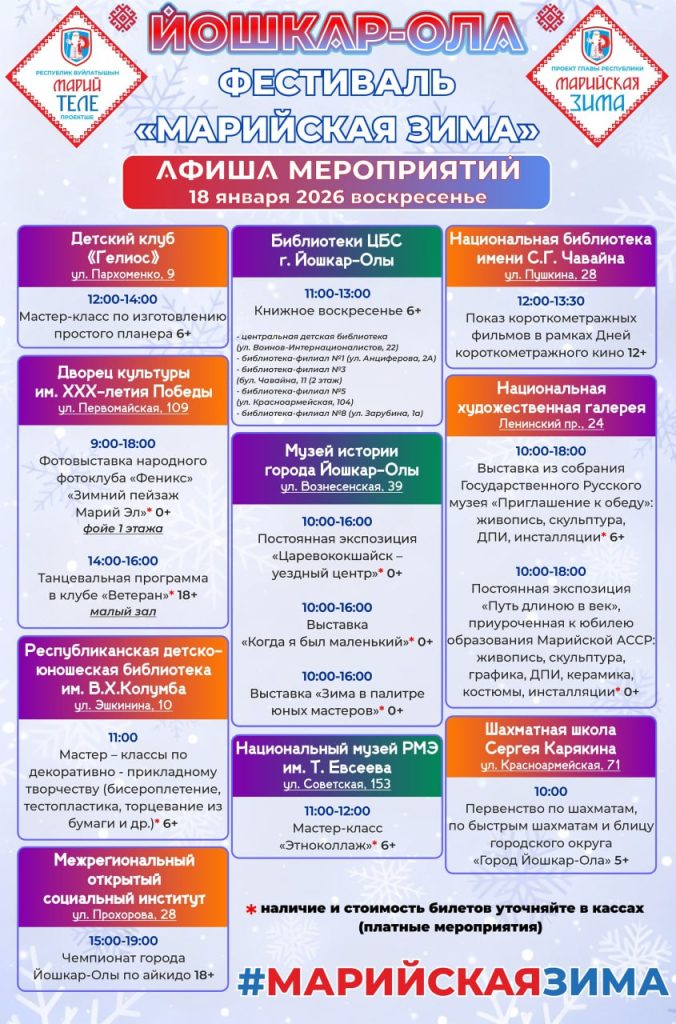 В субботу основные события развернутся во Дворце культуры имени ХХХ-летия Победы: здесь будут работать фотовыставка «Зимний пейзаж Марий Эл», акция «Ёлка желаний», новогодний фестиваль «Играй, гармонь — звени, частушка» и квиз «Секреты Рождества».