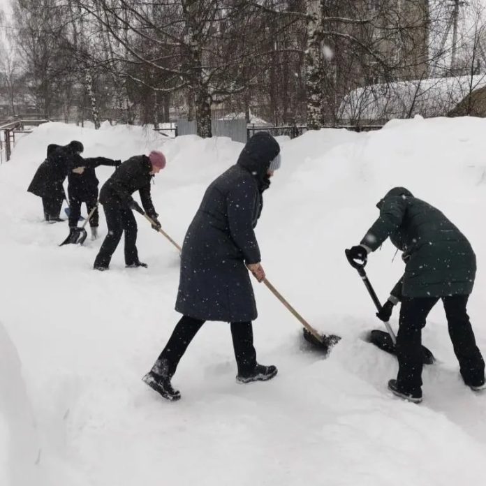 С самого утра во дворах и около общественных зданий прошли коллективные «Снежники». Сотрудники организаций, а также родители учеников и воспитанников детских садов выходили на улицы, помогая расчищать снег.