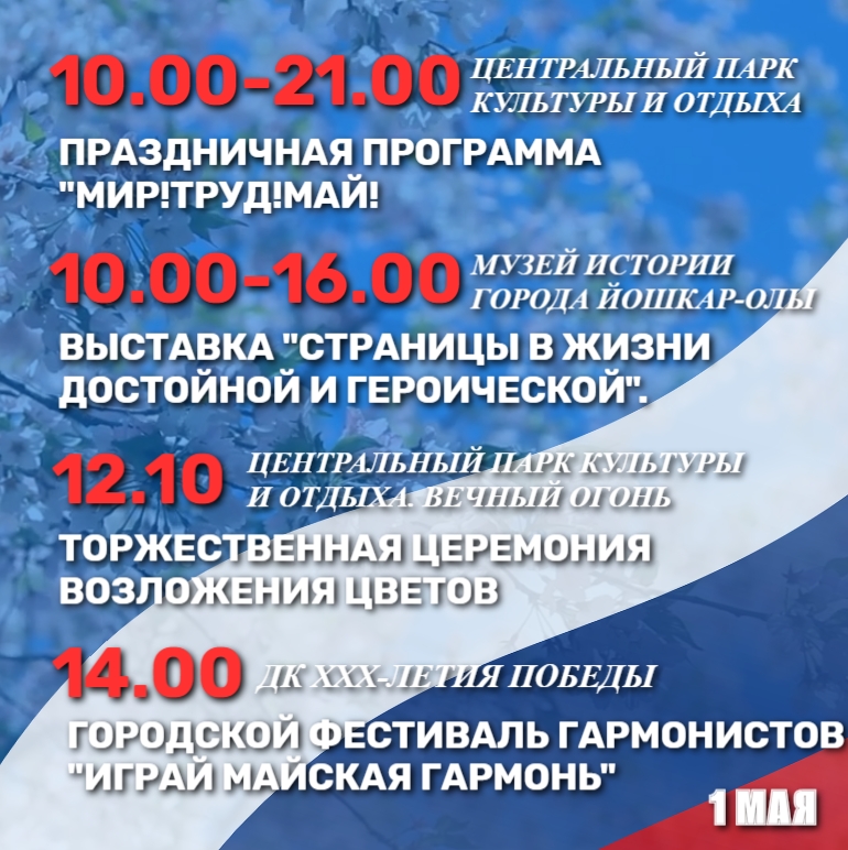 Параллельно в это же время в Центральном парке культуры и отдыха стартует программа «Мир! Труд! Май!», которая продлится до 21:00. Кроме того, на 1 мая также запланирован старт работы летних аттракционов.