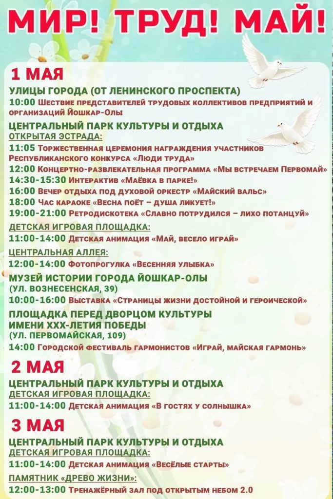 Ранее мы уже рассказывали, что главным днем празднования станет пятница, 1 мая. В этот день жителей и гостей столицы ждет традиционное праздничное шествие трудовых коллективов марийской столицы. Начнется оно в10:00.
