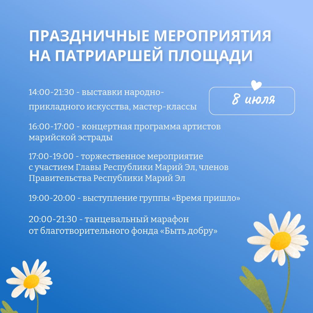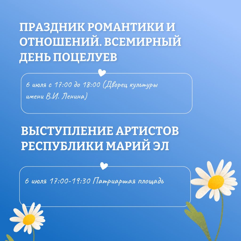 В Йошкар-Оле ко Дню семьи, любви и верности праздничные мероприятия начнутся уже 5 июля и пройдут на разных площадках города.