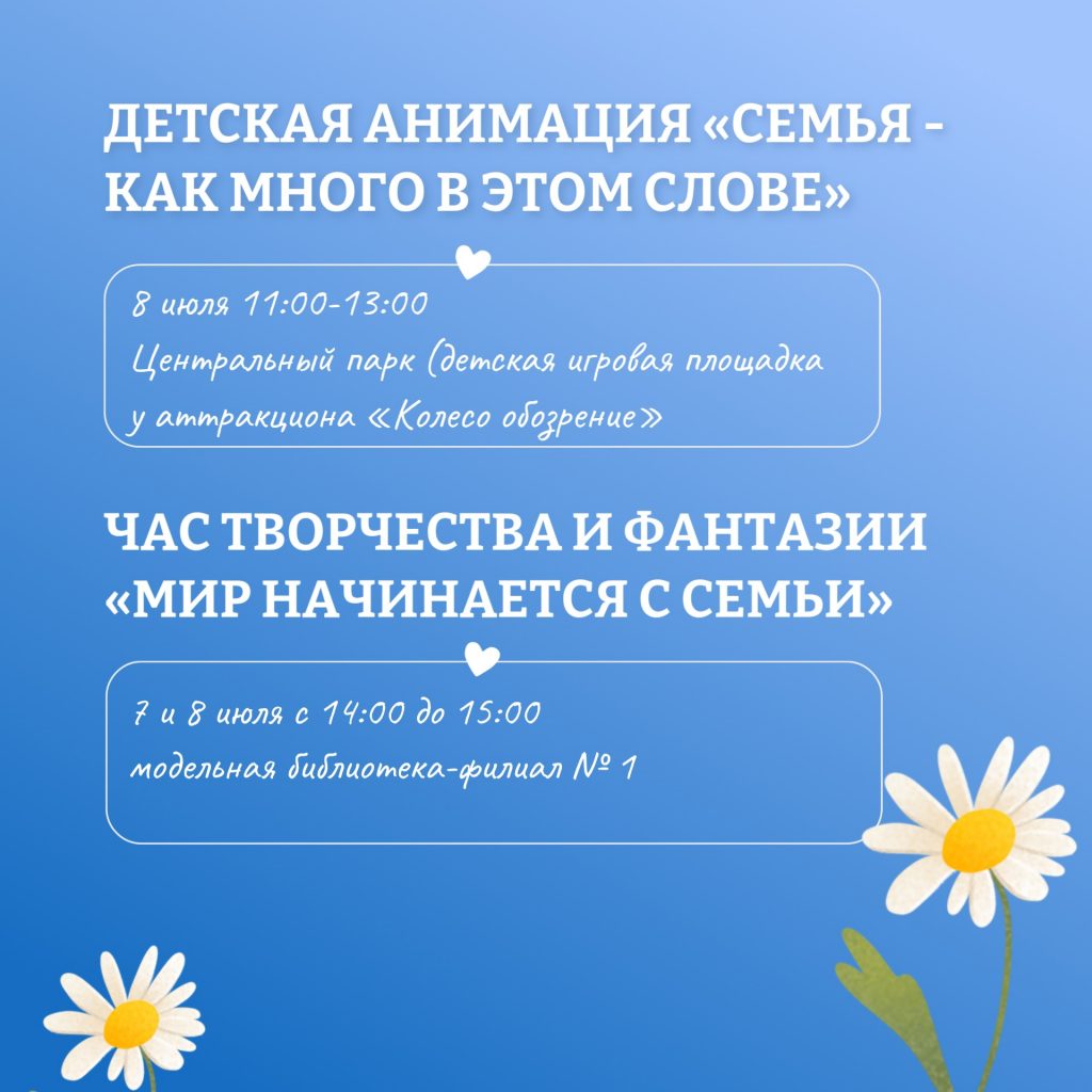 Так, 5 июля на бульваре Чавайна с 9:00 до 19:00 состоится ярмарка изделий декоративно-прикладного творчества, а в Центральном парке будет организована семейная анимационная программа «Играем всей семьёй».
