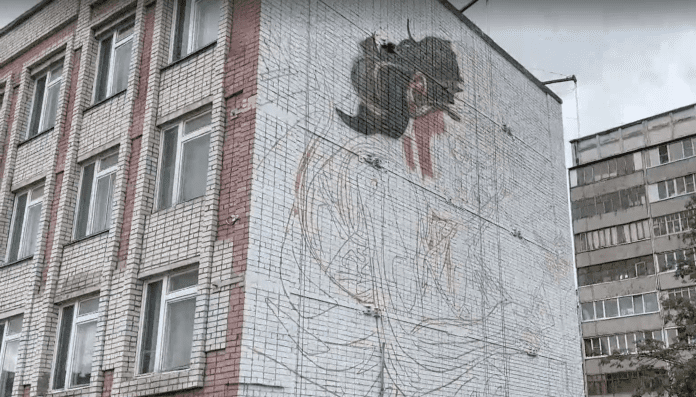 На фасаде школы №29 в Йошкар-Оле началась работа над масштабным граффити. Художник Илья Белов приступил к созданию рисунка «Встреча во сне».