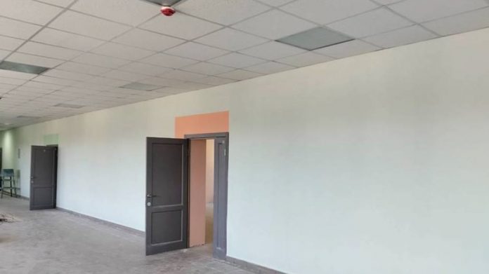 Стены покрашены, заменены двери, отремонтированы актовый и спортивный залы. На завершающем этапе — облицовка фасада и укладка плитки на первом этаже, завершается благоустройство вокруг здания.