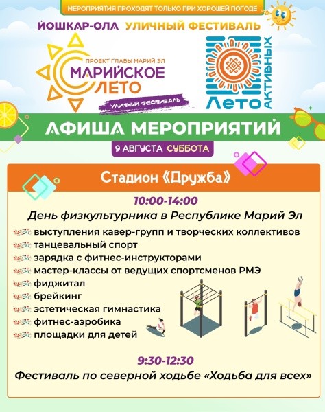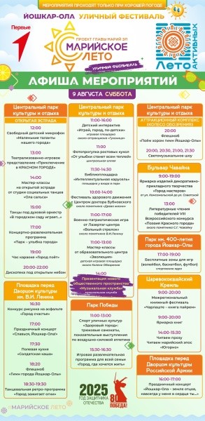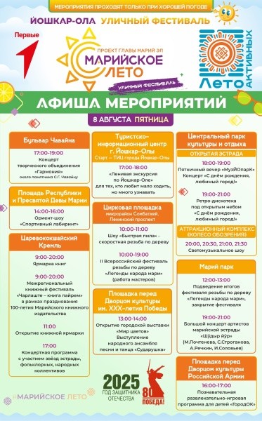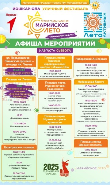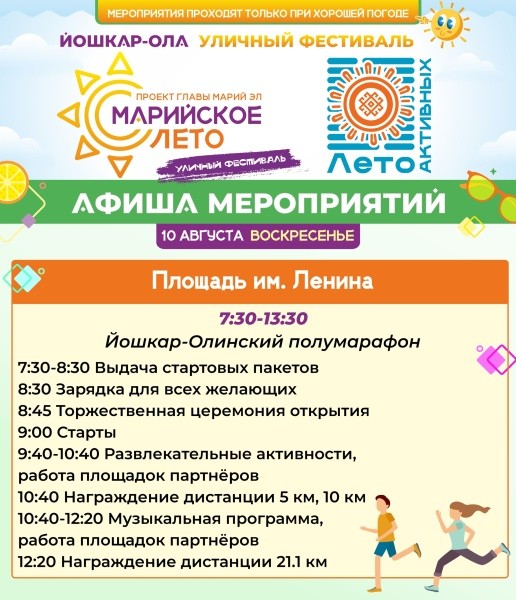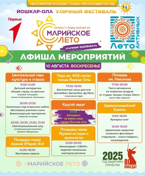 10 августа стартует 41-й Йошкар-Олинский полумарафон с забегом по центральным улицам и развлекательной программой. В Кремле продолжит работу книжная ярмарка с церемонией закрытия фестиваля. Также пройдут автокросс на Кубок мэра, музейные квесты и награждения участников городских конкурсов.
