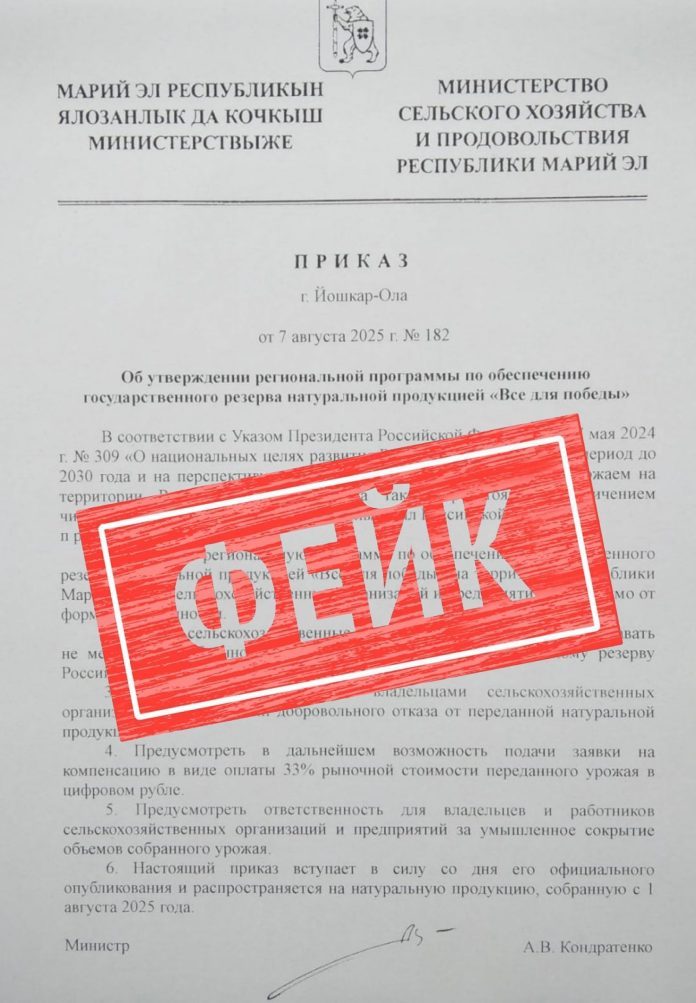 В нём утверждается региональная программа по обеспечению государственного резерва натуральной продукцией под названием «Все для победы». Однако в официальных реестрах и у самого министерства данный приказ отсутствует — это подделка.