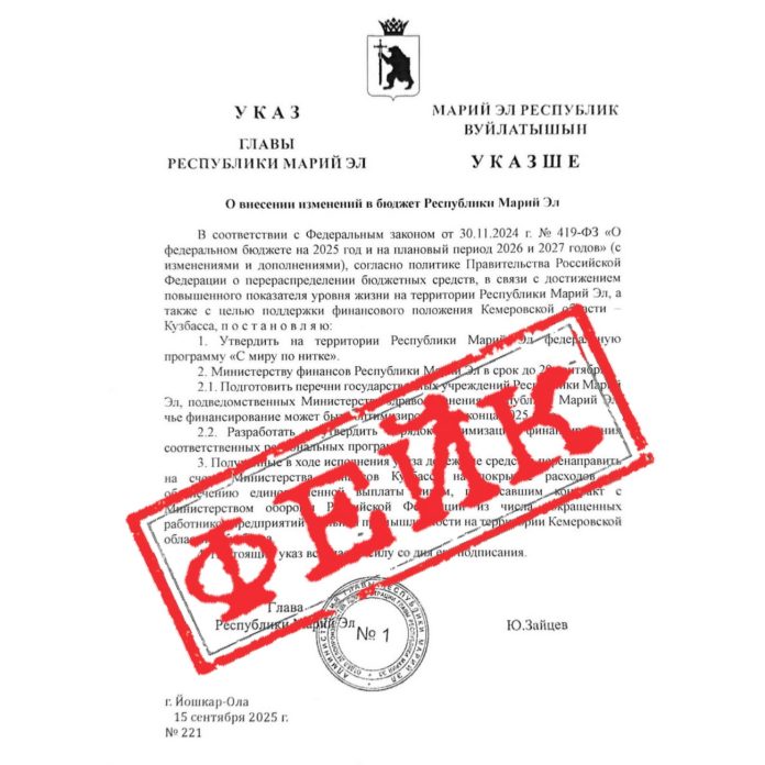 В соцсетях появился фальшивый указ Главы Марий Эл о поддержке Кузбасса через программу «С миру по нитке», якобы с подготовкой ведомств для перераспределения средств.