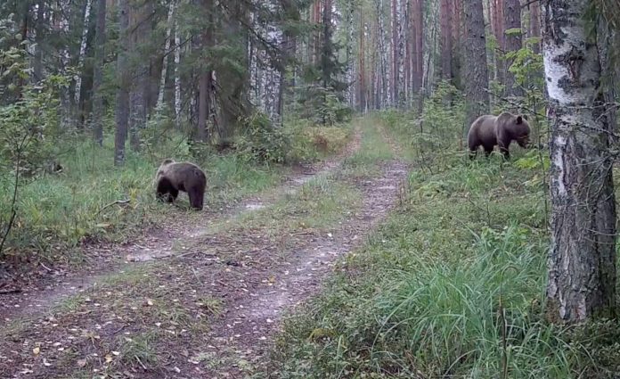 В одном из лесов Марий Эл камеры запечатлели медвежью семью — маму-медведицу с детенышем, которые внимательно исследовали окрестности в поисках пищи.