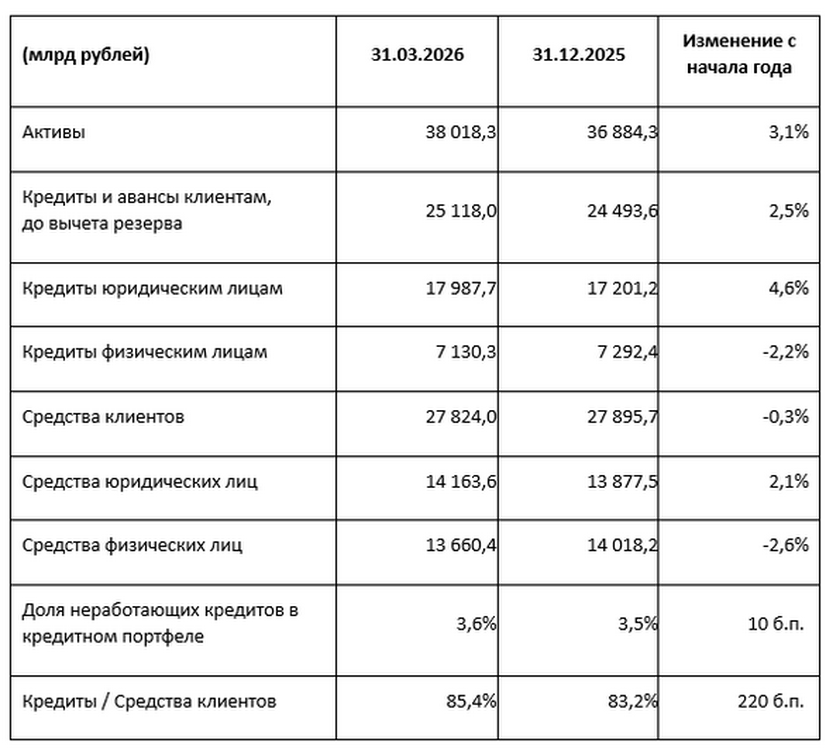 Средства клиентов — юридических лиц увеличились с начала года на 2,1% (с учетом корректировки на эффект валютной переоценки рост составил 1,1%), портфель средств клиентов — юридических лиц составил по состоянию на 31 марта 2026 года 14,2 трлн рублей. Объем средств клиентов — физических лиц сократился с начала года на 2,6%, составив по состоянию на 31 марта 2026 года 13,7 трлн рублей. По состоянию на 31 марта 2026 года доля розницы в средствах клиентов составила 49% по сравнению с 50% на конец 2025 года.