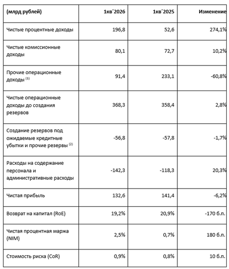 В целом результаты квартала находятся в пределах наших ожиданий и прогнозов и позволяют нам подтвердить цель по чистой прибыли 2026 года на уровне не менее 600 млрд рублей».